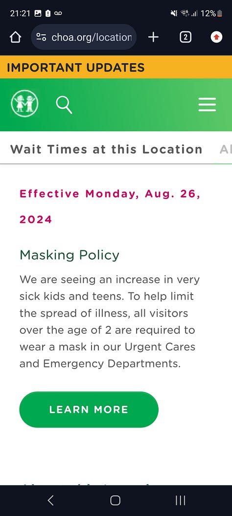 Today I noticed that CHOA (Childrens Healthcare of Atlanta) has followed suit. Both Emory and CHOA's main campuses are practically neighbors with the CDC on Clifton Rd in Atlanta. Think it's a coincidence that those two hospital systems would be first to mandate masks again in my area? Probably not.