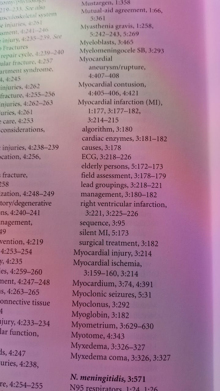 Just out of curiosity I pulled out my old text books from EMT and paramedic school. Attached are pictures of the text books, their copyright date, and pictures from the index in the paramedic volumes showing myocarditis, pericarditis, and SADS were not things that were on anyone's radar in EMS. Same story in the EMT text book. They were so rare that we weren't really taught much at all about these conditions. As far as I know SADS didn't exist until 2021, but the other two were only mentioned by our instructor in passing. Why? Because they were <Fauci>raaaaare</Fauci>.