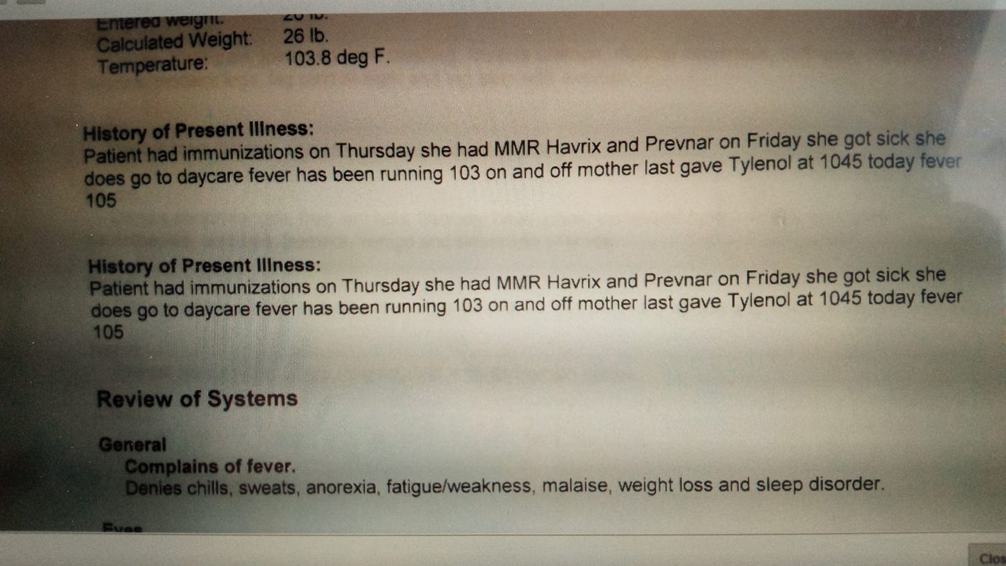 Another call today was a 2 year old with high fever and pneumonia. She took 3 vaccines on Thursday then began getting sick on Friday. She took the MMR, Havrix (Hep A vaccine), and Prevnar (pneumonia vaccine). She began having a fever Friday. Developed a mild cough with the fever on Saturday. Sunday the cough became severe with some mild difficulty breathing and higher fever. Today her fever topped out at 105 f and she was diagnosed with pneumonia at the doctors office. She was down to 103.7 f when we transferred her to the emergency room. At the doctors office I asked the nurse which vaccines the child had taken and she immediately said "The vaccines didn't cause any of this. She didn't get sick until the day AFTER taking her vaccines.".